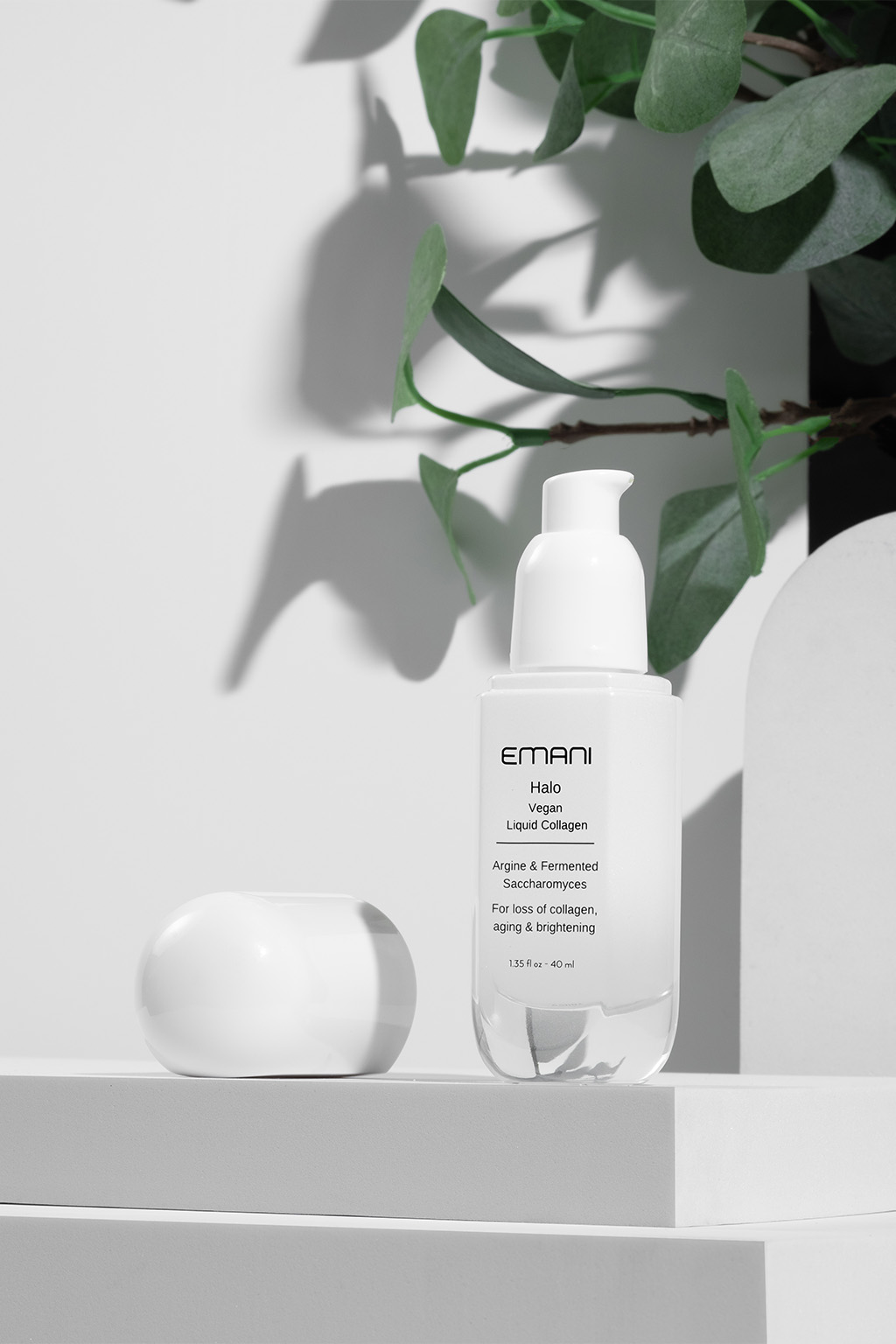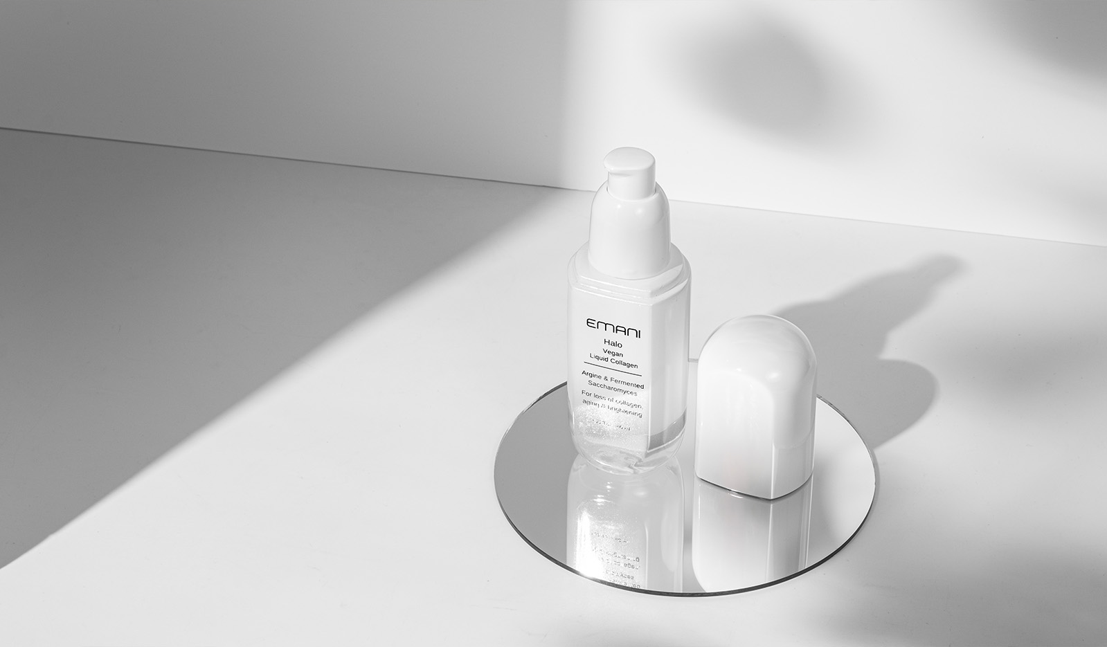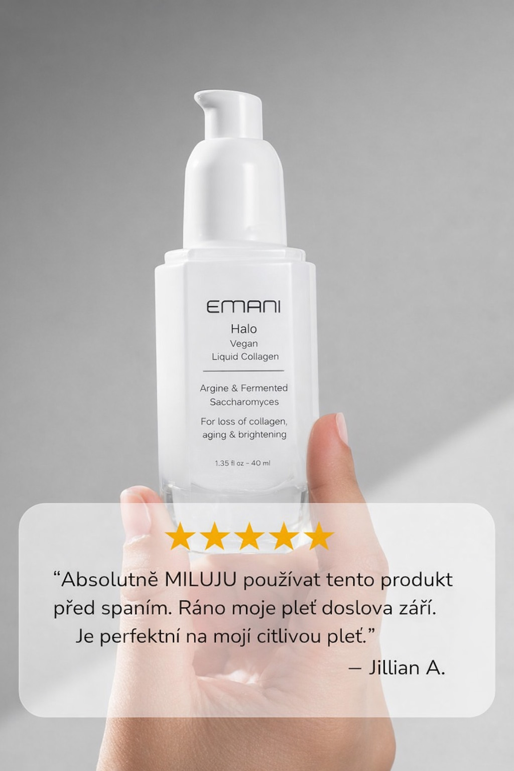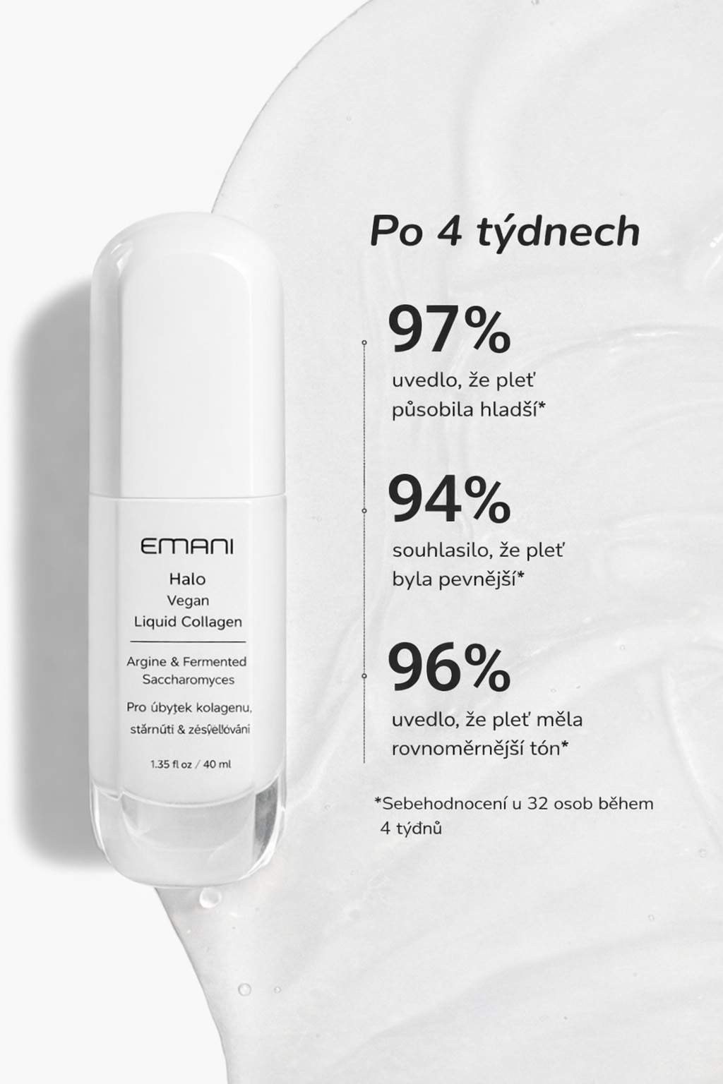 Testovaným produktem je EMANI Halo Vegan Liquid Collagen – pleťové sérum s obsahem fermentovaného veganského kolagenu, které pomáhá: