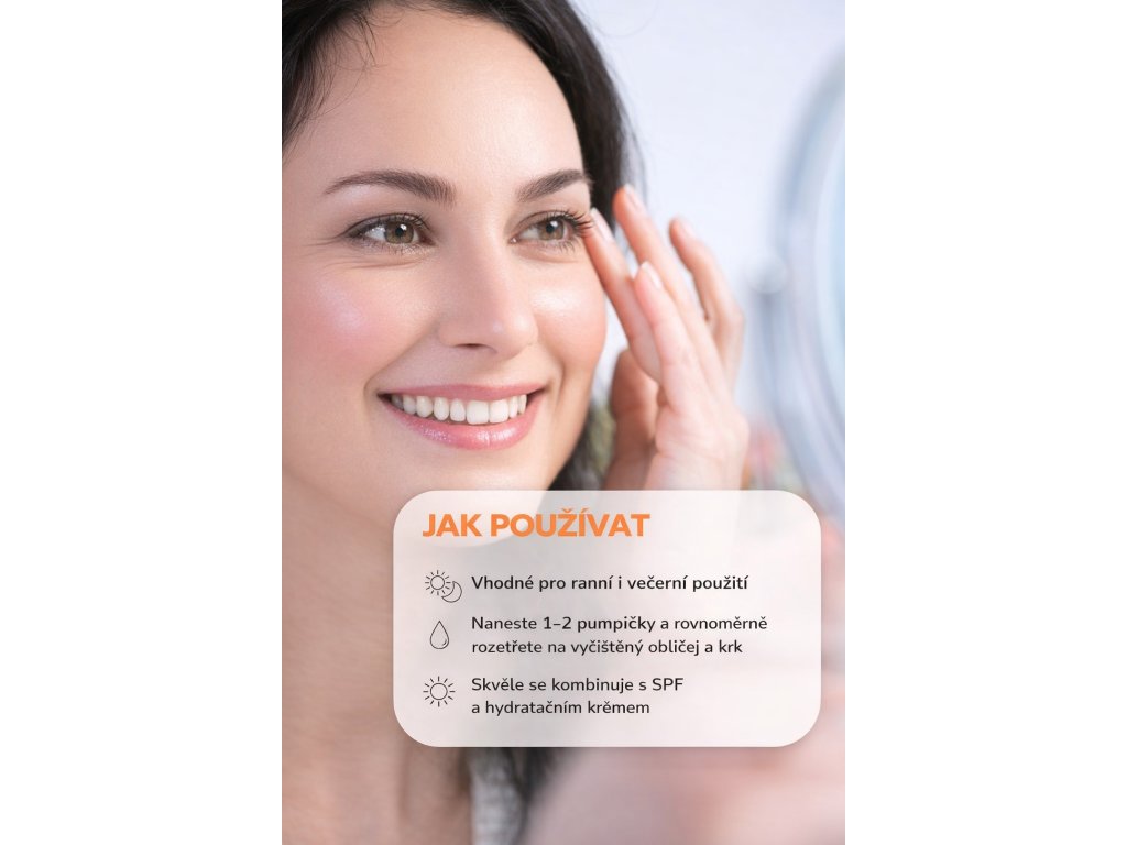 Naneste na čistú pleť, ideálne ráno. Začnite v strede tváre a jemne rozotrite smerom von. Produkt môžete používať samostatne ako sérum alebo ako podklad pod make-up pre lepšiu výdrž a krajší vzhľad.