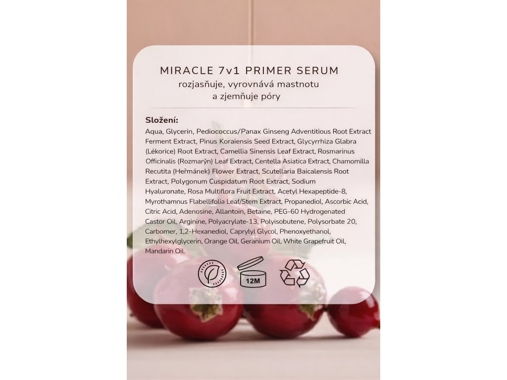 Miracle 7-in-1 Primer Serum je multifunkčný produkt – sérum aj primer v jednom. Zjemňuje textúru pleti, vyrovnáva mastnotu v T-zóne a redukuje veľkosť pórov. Obsahuje fermentovaný ženšen a spevňujúce peptidy, ktoré podporujú tvorbu kolagénu a viditeľne redukujú jemné linky a póry.